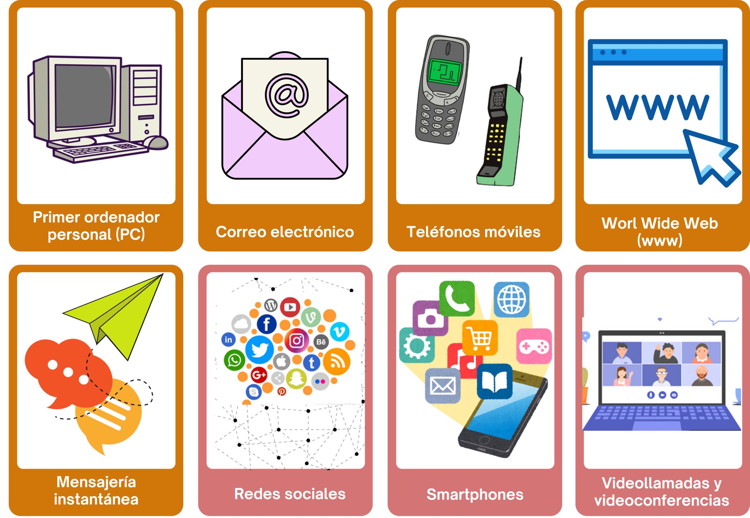 Texto de información al docente (con imágenes, contenidos básicos y contextualización curricular), línea del tiempo ilustrada, fichas de trabajo, ordenador o tableta con acceso a internet, vídeos cortos sobre avances en la comunicación, material gráfico para murales (cartulinas, rotuladores, recortes de revistas).